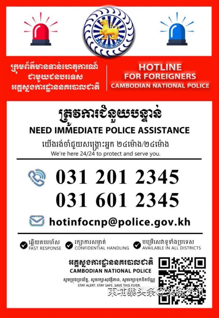 【柬埔寨头条综合报道】柬埔寨国家警察总署8月7日通过官方脸书发布通告,正式开通24小时外国人紧急救援热线。